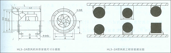 ![]() HL3-2A型風(fēng)機(jī)外形安裝尺寸