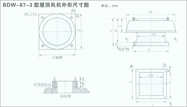 BDW-87-3型屋頂風(fēng)機(jī)性能參數(shù)、安裝外形尺寸